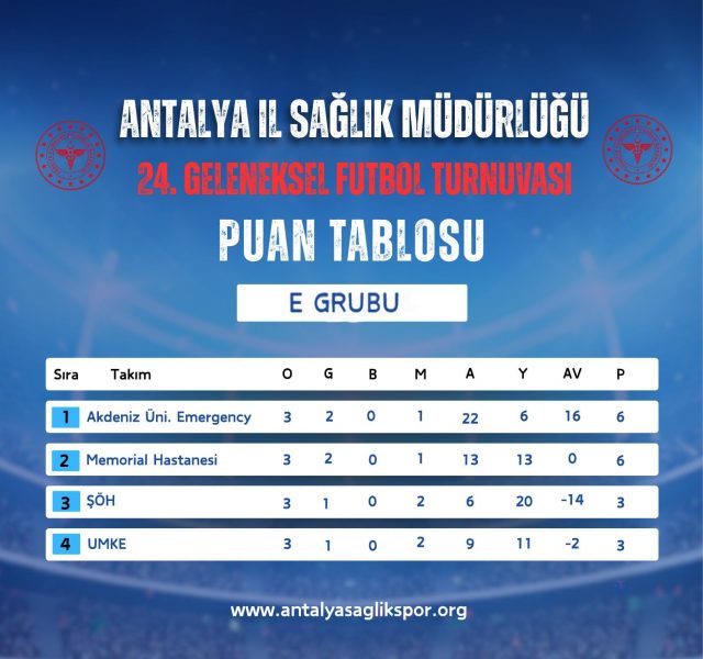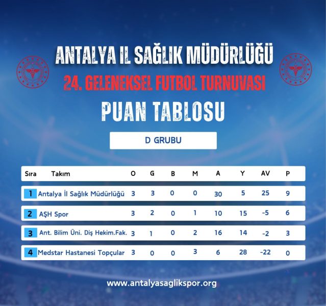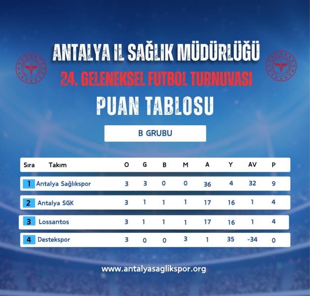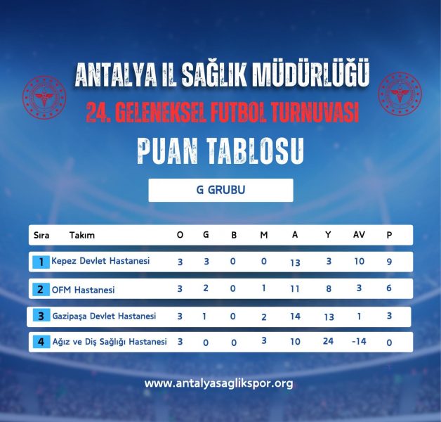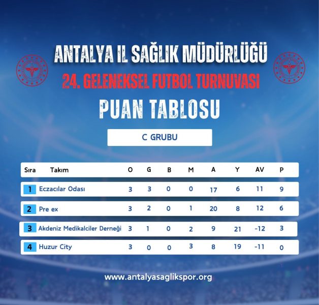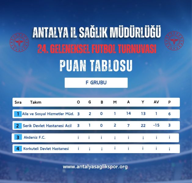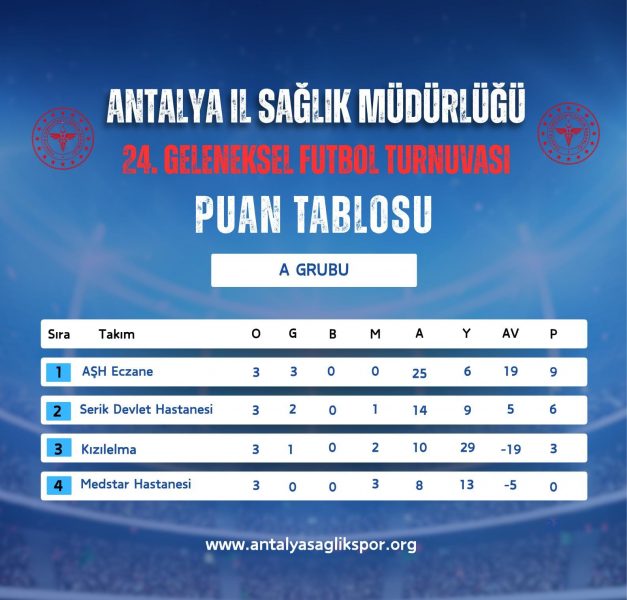 Antalya İl Sağlık Müdürlüğü 24. Geleneksel Futbol Turnuvasında 18.11.2025 tarihinde oynanan karşılaşmaların ardından grup maçları sona erdi. A Grubunda AŞH Eczane, B Grubunda; Antalya Sağlıkspor, C Grubunda; Eczacılar Odası D Grubunda Antalya İl Sağlık Müdürlüğü, E Grubunda Akd. Üniv. Emergency, F Grubunda Aile ve Sosyal Hizmetler Müdürlüğü ve G Grubunda Kepez Devlet Hastanesi gruplarını lider tamamlayarak çeyrek final öncesi onaltı elemeleri için seri başı oldular. En iyi 2. olan Pre Ex G grubu için seri başı olmuştur. Grup 2.leri AŞH Spor, OFM Hastanesi, Memorial Hastanesi, Serik Devlet Hastanesi Acil, Lossantos ve Serik Devlet Hastanesi ile en iyi grup 3.sü Antalya SGK ile Gazipaşa Devlet Hastanesi çeyrek final öncesi Onaltı elemeleri oynamaya hak kazandı.