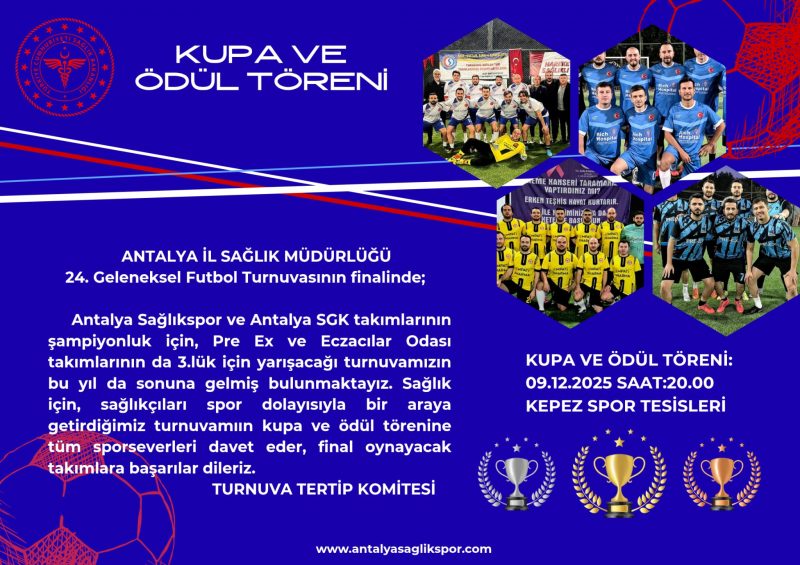 Antalya İl Sağlık Müdürlüğü 24.Geleneksel Futbol Turnuvasında 24.Şampiyonluk için Antalya Sağlıkspor ile Antalya SGK 09.Aralık.2025 tarihinde Saat 19:00’da Kepez Spor Tesisleri Spor Kompleksi 1 Nolu sahada Şampiyonluk için sahaya çıkacak. Eczacılar Odası ile Pre Ex Turnuva 3.lüğü için Saat 19:00’da 2 Nolu sahada karşı karşıya gelecek.